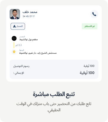 بعد تأكيد الطلب، يمكنك متابعة حالة التوصيل مباشرة من داخل التطبيق ومعرفة موقع المندوب حتى وصول الطلب.