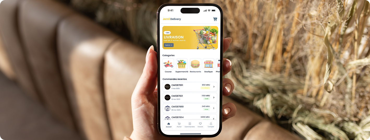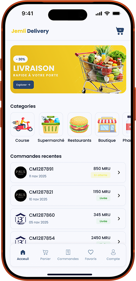Jemli هو تطبيق توصيل يتيح لك طلب الطعام من المطاعم، التسوق من المتاجر، أو طلب توصيل مخصص من أي نقطة إلى أي نقطة داخل نواكشوط بسهولة وسرعة.